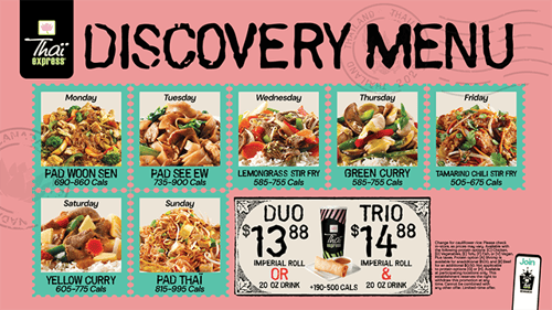 Thaï Express yourself every day of the week with our brand-new Discovery Menu! Our seasonal menu has made return! Turn any of our daily specials into a duo or trio!